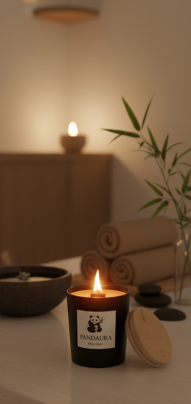 A Pandaura szójaviasz illatgyertya fekete kerámia tégelye és barna fedele eleganciát csempész minden térbe. A természetes fa kanóc finom ropogása és a 4 különleges illat (vanília, citrus, mézeskalács, levendula) prémium, hangulatos atmoszférát teremt.
