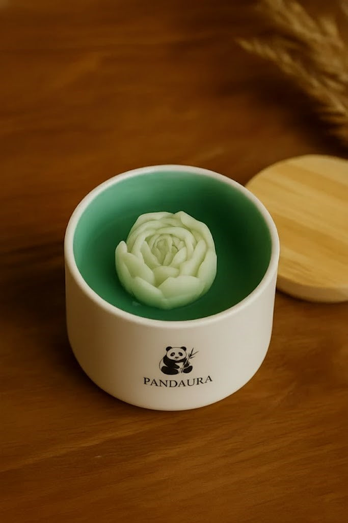 A Serenity Bloom a béke és a természet esszenciáját zárja magába. Ez a kézzel öntött, 100% természetes szójaviasz gyertya elegáns, fehér kerámiatégelyben kapott helyet, közepén finoman formált zöld-fehér virágmotívummal.